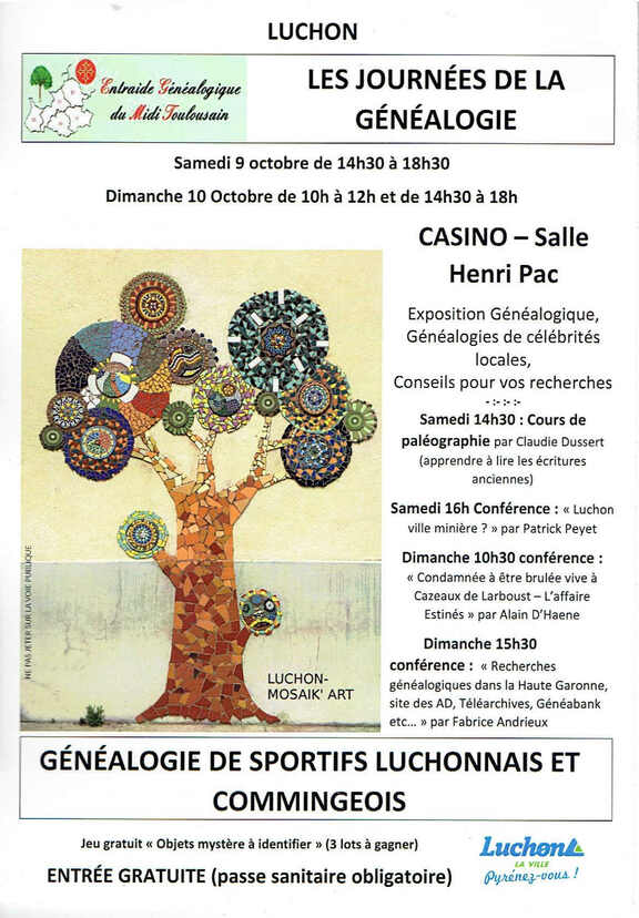 Journées exposition de l'antenne de généalogie de Luchon (entraide généalogie midi toulousain). Cette année, le thème portera sur les sportifs du Luchonnais et du Comminges. Exposition de généalogies de célébrités, conférences, cours de paléographie.