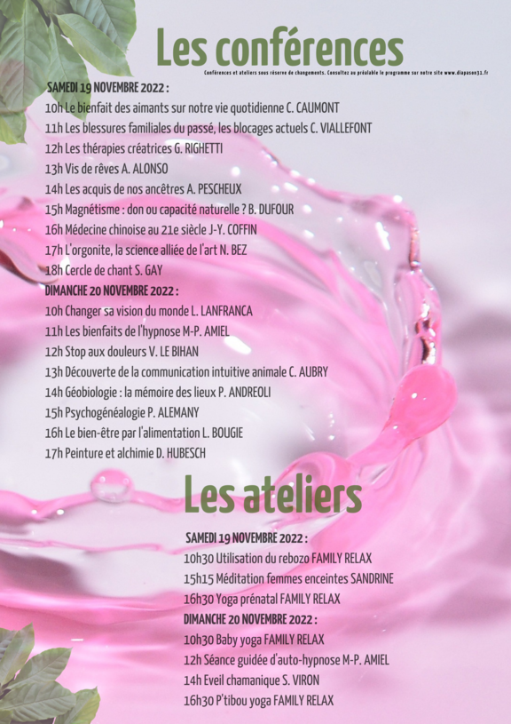 Retrouvez nos 75 exposants et thérapeutes sur le thème du bien-être et du développement personnel ; des conférences gratuites vous seront également proposées tout au long du week-end, ainsi que des ateliers. Entrée libre.