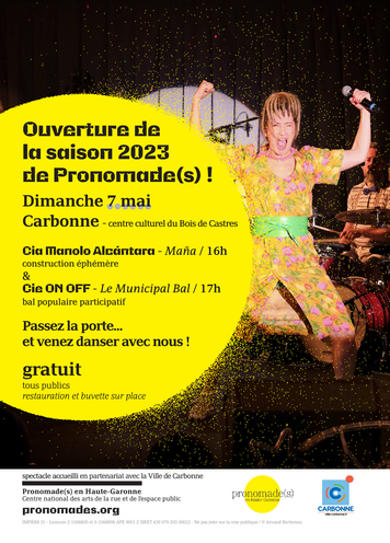 C'est parti, soyez des nôtres pour l'ouverture de notre 24e saison ! Nous vous donnons rendez-vous à Carbonne pour une fin de dimanche festive et conviviale autour de deux spectacles : une prouesse de construction de la Compania Manolo Alcántara et une invitation à enflammer la piste de danse avec la Compagnie On Off… et ça tombe bien, le lendemain c'est férié !