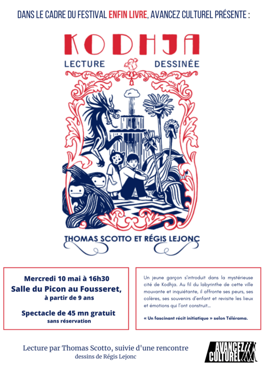 Thomas Scotto interviendra au collège du Fousseret mais nous proposons aussi à tous de venir l'écouter en famille dans la très belle lecture dessinée de son album Kodhja le mercredi 10 mai à 16h30 à la salle du Picon du Fousseret... qu'on se le dise !