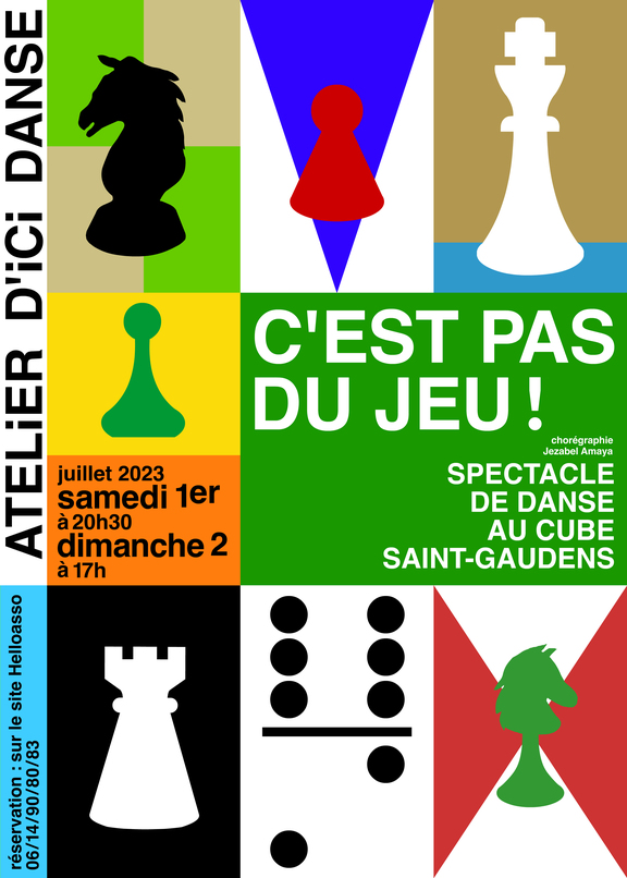 C'est pas du jeu ! Spectacle chorégraphique de l'Atelier d'Ici Danse, présenté par les élèves des cours de danse de Jézabel AMAYA, cours éveil, initiation, danse classique, danse contemporaine et modern'jazz et le groupe handidanse Le Comtal. Joutes dansées, adversité comme complicité animeront la scène devenue plateau de jeu pour accueillir nos 150 danseurs et danseuses. Samedi 1er juillet à 20h30 et dimanche 2 juillet à 17h au Cube à Saint-Gaudens