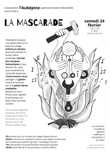 l'Aubépine propose une après-midi sur la place du village. Enfants et adultes pourront prendre le temps d'être ensemble, bricoler des masques fantastiques et leur donner vie, mais aussi entendre les sonorités aériennes d'instruments rares, partager un goûter coloré et terminer par une petite danse endiablée ! Masquons-nous d'hiver pour appeler le printemps à la façon d'un carnaval inventé.