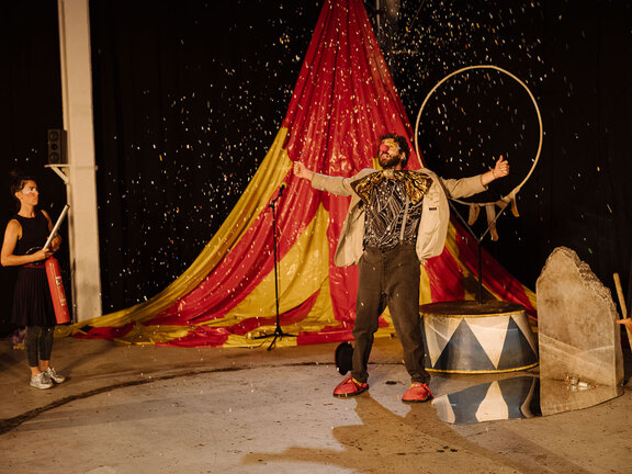 Devant les vestiges d'un chapiteau, quatre figures de cirque traditionnel nous accueillent. Tout semble écroulé, mais elleux continuent : ça commence, iels se lancent, mais ce soir le doute, comme un coup de bâton, les frappe. Et si le spectacle n'agissait plus ? Et si le spectacle ne pouvait plus rien ici parce qu'il était partout dehors, y compris en chacun·e de nous ?