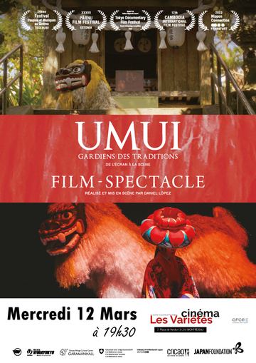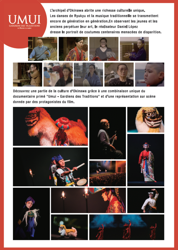 Afin d'offrir un aperçu de la beauté et de la diversité des arts de cet "autre Japon", le spectacle "UMUI - Gardiens des traditions" met en scène une sélection de danses d'Okinawa, classiques et traditionnelles ainsi que le chien-lion, fil rouge du film et qui dans le spectacle devient le narrateur de l'histoire d'Okinawa, autrefois Royaume de Ryūkyū.