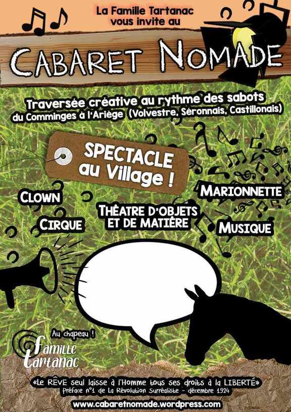 Tout au long de cette tournée spectacles, nous proposons un cabaret tout public (1 heure) à base de cirque, théâtre d'objets et de matière, marionnette, clown et musique.au rythme des sabots !
