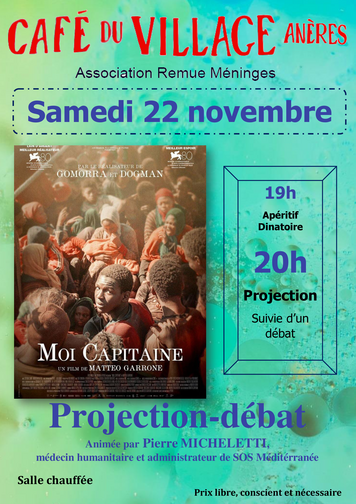 20h : projection (salle chauffée) du film "Moi Capitaine" de Matteo Garone, puis discussion sur le film animée par Pierre MICHELETTI (SOS Méditéranées, Médecins du Monde, etc.).
