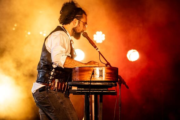 Un homme, une guitare posée à plat, des harmonicas, un tambourin au pied, un "kick" au poing... et une énergie folle !
