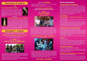 A partir de 10 h : stages de danses basques (mutxikoak, fandango), de danses occitanes pour débutants, de hautbois, d'accordéon diatonique (répertoire nissard), de chant (animé par Arnaud Cance) et de halhòts dera Sent Joan